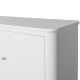 De Wood multikast kenmerkt zich, net als de andere meubels uit de Wood Collection, door de verfijnde details. Een speciale 'soft lock'-functie dempt het sluiten van deuren, zodat kleine vingers niet bekneld raken. De multikast wordt geleverd met 3 smalle legplanken en 3 brede legplanken, waarvan er een vast zit. De kast heeft 3 deuren welke zijn gescheiden door een horizontaal accent. De indeling van de deur draagt __bij aan het gevoel van evenwicht en geeft de multikast zijn karakter. De innovatieve pulls gemaakt van lussen van volnerf leer zijn gekoppeld aan de kasten met 3 deuren. De zijkanten van de multikast zijn ontworpen met gentegreerde, ronde haken om alles op te hangen, van de outfit van de dag tot balletschoenen of badjassen. Met een lichte druk integreren de haken met de zijkant van het meubilair, waardoor ze zowel decoratief als praktisch zijn.