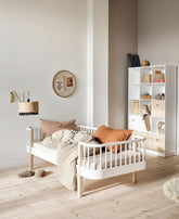 Oliver Furniture - Wood Day bed wit/eiken 90 x 200 cm - 041405. Het Wood day bed heeft een mooie touch uit de jaren 50 vermengd met het warme Scandinavische eiken en pure eenvoudige lijnen. Overdag kan de bedbank gemakkelijk worden gebruikt als knusse bank met veel dekens en kussens. Het is een perfecte interieuroplossing voor het zomerhuis of de logeerkamer. Het Wood daybed kan worden aangevuld met een bedlade voor opbergruimte.