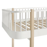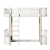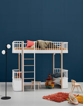Oliver Furniture - Wood Hoogslaper wit/eiken 90x200 cm - 041429. De Wood hoogslaper is met zijn unieke design uniek in zijn soort op het gebied van kinderbedden. Het is het perfecte bed voor het oudere kind. Voorin het bed is een ruimtebesparende ladder geplaatst en daaronder zijn kleine bankjes met planken geplaatst. De hoogslaper kan worden aangevuld met een vloerkussen en een kleine tafel.
