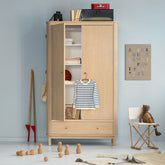 De afgeronde hoeken geven de kledingkast een optisch lichte uitstraling, terwijl de afgeronde randen aan de achterkant een subtiel onderscheid met de muur creëren. De zijkanten zijn voorzien van geïntegreerde, uittrekbare haken om alles op te hangen, van dagelijkse kleding tot balletschoenen of badjassen. De uittrekhaken bieden extra opbergruimte en hebben daardoor zowel een decoratieve als een praktische functie.