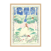 This hand-illustrated and painted artwork by Forivor’s Alice Ruby Ross is a love song to the swan and our human connection to them. Inspired by the poem 'Wild Swans at Coole' by W.B. Yeats, the print evokes the many tales from mythology to folktales that often explore the idea of women and swans turning into one another. Here the woman looks up to the migrating swans above and her dress begins to change into feathers, the moment of transformation is captured.